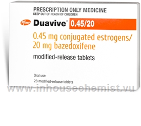 Duavive tablets 0.45mg/20mg are a modified-release tablet containing a hormone component of conjugated oestrogens, which is a mixture of natural oestrogen in different forms, including estrone, equilin, 17α-estradiol and 17β-estradiol; also a non-hormone component bazedoxifene, which is belongs to a group of drugs known as selective estrogen receptor modulators (SERMs). These two components in Duavive tablets are used in combination for hormone replacement therapy (HRT) to relieve symptoms of menopause. Oestrogen is the female steroid hormone produced by the ovaries that binds to specific receptors inside oestrogen-responsive cells and stimulates them to make proteins involved in several aspects of female secondary characteristics including regulating the menstrual cycle. Oestrogen also has several other actions in various metabolic processes including maintaining bone mass and lipid (fat) metabolism. Conjugated oestrogens in Duavive tablets substitute for lack of endogenous oestrogen (produced by the ovaries) and bind to the oestrogen receptor in various tissues where they demonstrate tissue selective oestrogen receptor agonist activity to alleviate symptoms of menopause. They also bind to oestrogen receptors in the endometrium (lining of the uterus) where they stimulate growth of the endometrium. However, unopposed oestrogen actions can increase the risk of endometrial hyperplasia and cancer. Bazedoxifene in Duavive tablets acts as an oestrogen antagonist, by binding to the oestrogen receptor in the uterus and this counteracts the effects of oestrogen on endometrial cell growth, which reduces the risk of endometrial cancer. The combination of an oestrogen agonist and antagonist works to relieve the various symptoms of menopause and provides selective protection against endometrial cancer.